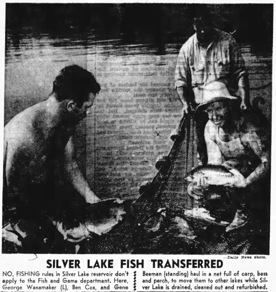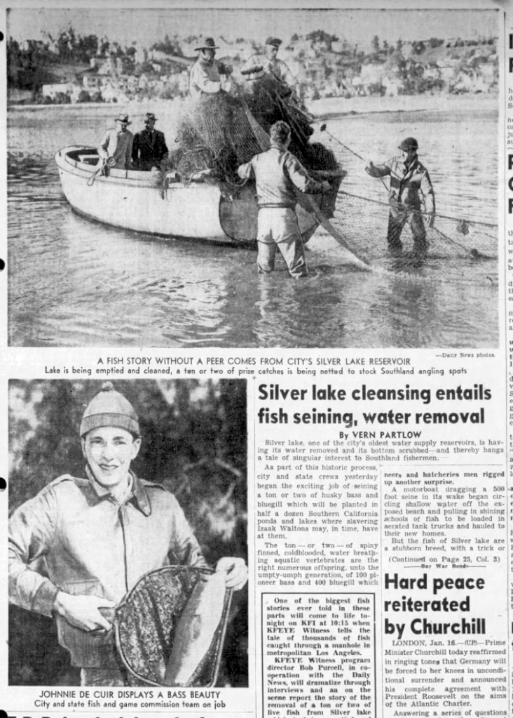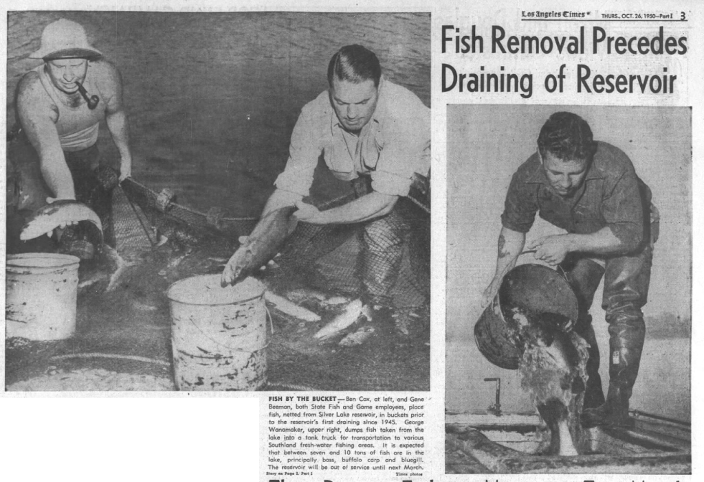 The fish were again relocated. This time, the newspapers offered the estimate that there were 100,000 – or seven to ten tons. Although the DWP promised their return, at least some were dumped into Ballona Creek. It seems unlikely that any returned, though — asphalt and concrete are not normally part of the piscine diet.