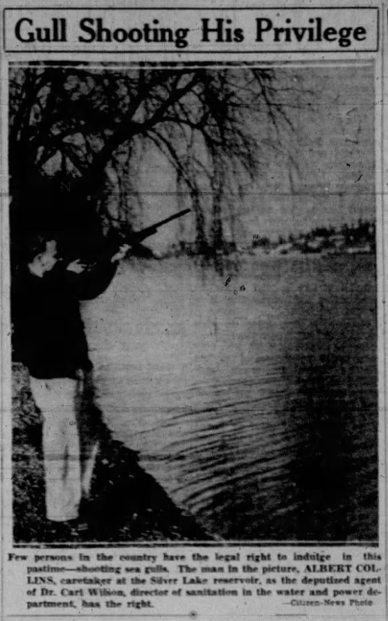 Although much of the discussion about the Silver Lake Reservoir today revolves around the wellbeing of wildlife, animal welfare was, historically, evidently a non-concern. In 1931, the Police Commission granted the caretaker/director of sanitation for the water and power bureau to fire blasts from his shotgun in order to keep mudhens, ducks, geese, gulls, and other birds from making “a bird resort out of the Silver Lake reservoir.” Although meant to just scare the birds, shotgun blasts aren’t exactly known for their pinpoint accuracy and if animals were harmed in the shooting of them, this was duly logged and recorded without the apparent shedding of any tears.