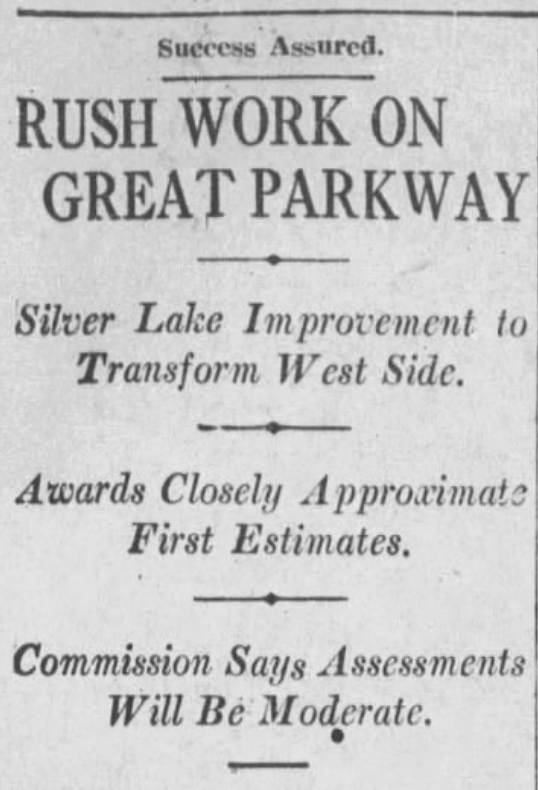 It was around 1911 that Angelenos began first referring to the surrounding community as Silver Lake instead of Ivanhoe or Edendale (although those names also remained in use for a time). It was also in 1911 that some began to refer to the neighborhood as “Silver Lake Park.” That year, plans were made to upgrade the reservoir complex into a gem of the park system. The park itself was to have been beautified. It was also to have served as the centerpiece of a series of parks connected by landscaped, scenic boulevards — or “parkways.” Initially more modest, the scope of the project eventually sought to connect Elysian Park, Griffith Park, Sunset Park (now Lafayette Park), Eastlake Park (now Lincoln Park), and Westlake Park (now MacArthur Park); with Silver Lake Park the literal centerpiece. If completed as planned, it was reported, it would form a “parkway system rivaling if not surpassing those of Cleveland and Seattle.”