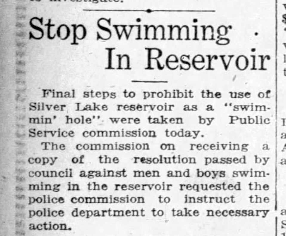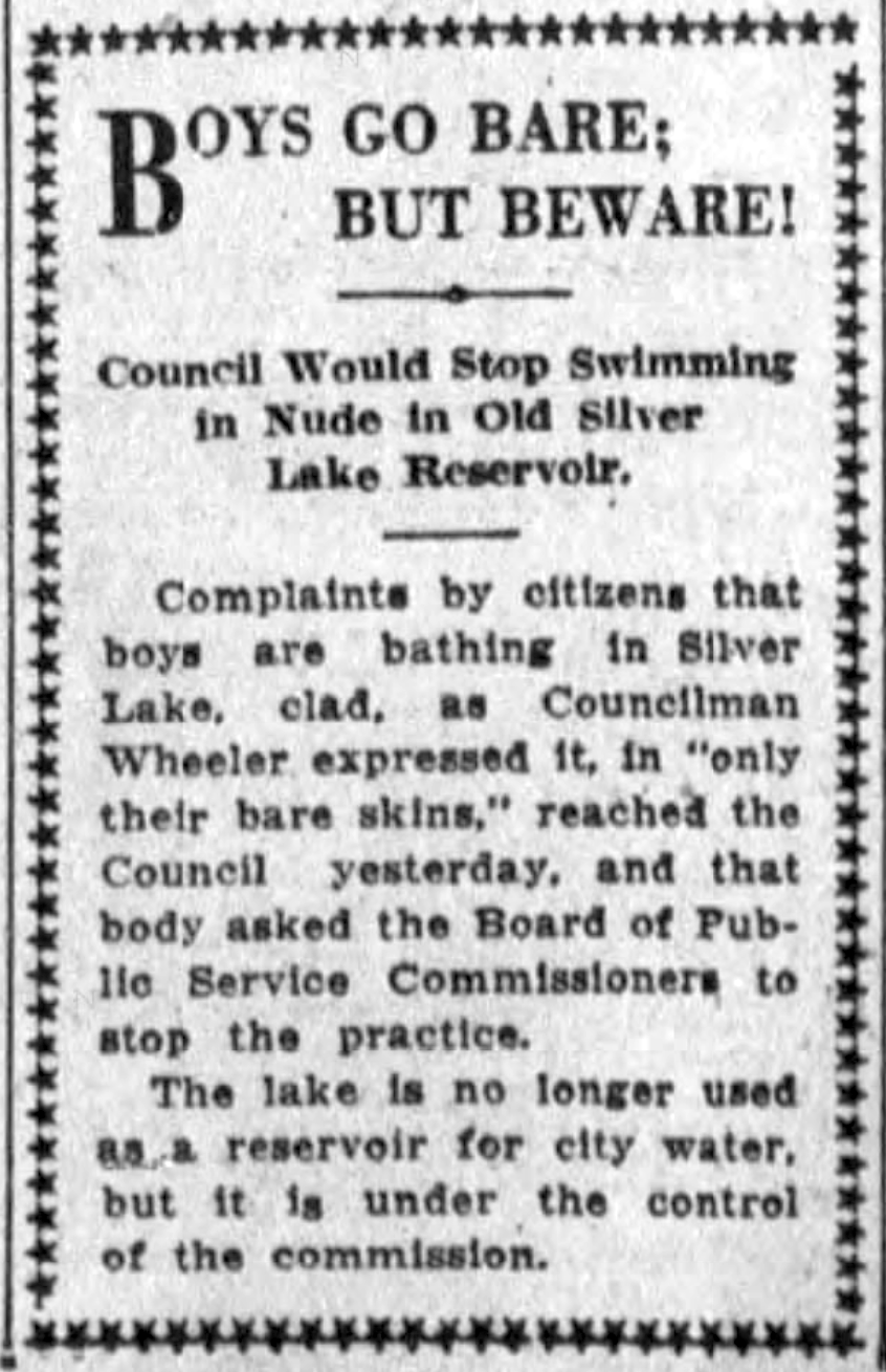 Although more than a decade would pass in which there was no fence, swimming was banned in 1920. That year, at the urging of some of his vocal constituents, Socialist City Councilman Fred C. Wheeler introduced a motion at City Hall to “prohibit bathing in Silver Lake.” The Los Angeles Evening Post-Record reported that “This action should be taken, the resolution claims, not because the water is being polluted, as it is not used for domestic purposes, but for the reason that men and boys have been bathing in the lake garbed in nature’s clothing.” The skinny-dipping ordinance passed in August 1920 and the authorities were instructed to “take necessary action” to “prohibit the use of the Silver Lake Reservoir as a “swimmin’ hole’.”